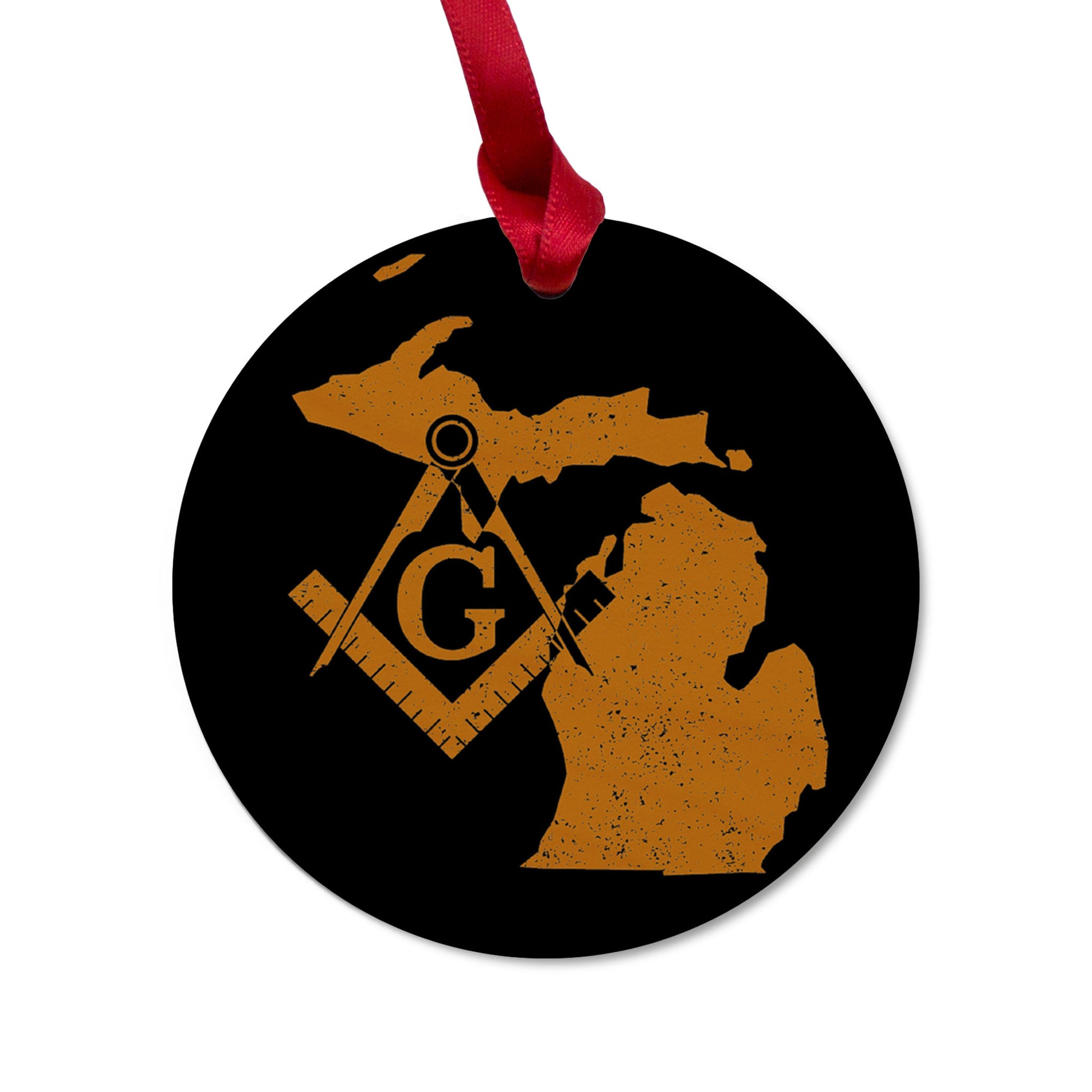 Michigan square & compass freemason symbol state map - Round Wooden Maple Ornament